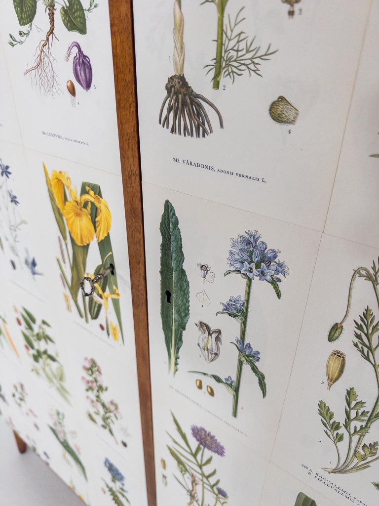 Crafted in mahogany, the cabinet stands on elegant tapered legs and features a well-balanced, timeless silhouette. The exterior is fully clad in detailed botanical illustrations, creating a vivid yet refined surface that captures the joyful spirit of mid-century design.